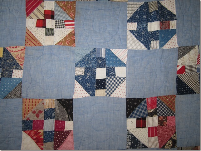 There have been a lot of Churn Dash blocks on blogs lately. Thearica has a Churn Dash linky and although I did not make this unique Churn Dash quilt, I promised her that I would post it. It is a vintage quilt that is not particularly well made, but I love all of the scraps used in it. This was done before all of our fancy tools, rotary cutters and beautiful scraps. I am sure it was a utility quilt made from scraps.