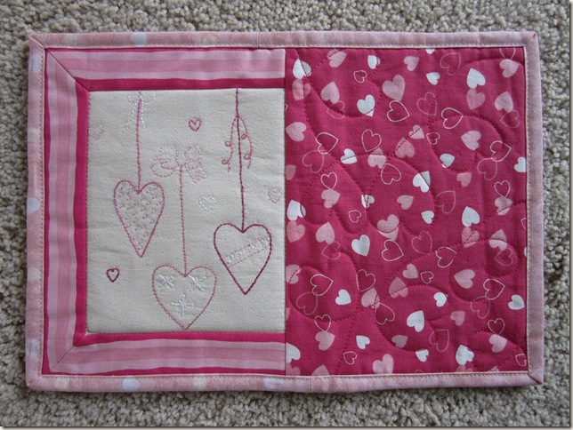 Another great package came from Maria. We belong to a mug rug swap and she was my partner this month. Look at her beautiful mug rug she sent me. I love the darling hearts that she embroidered on it and the fun little extras that she included.
