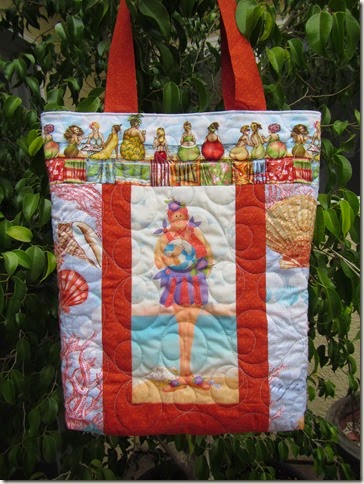 Sewing has taken a back seat – other than a lot of logo embroidery, hemming dresses and mending, but I did make a beach bag. I had some of the “Fruit Ladies” fabric and thought it would look cute on a quilted bag.